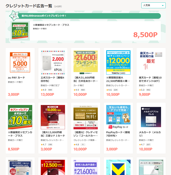 もちろん数千P程度のカードでしたらこれ以外にも沢山ありますので、タイミングによっては10万P近くは狙えます。
